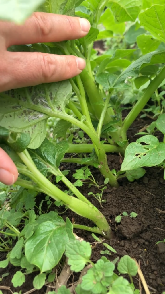 シワシワの種芋からしっかりした葉茎が出てきました。写真はきたあかりです。観察日は3月下旬、寒い日が多かったからか、北海道産の品種(きたあかり、ほっかいこがね、わせしろ、きたかむい)は芽が出ていたものの、九州の品種(にしゆたか、でじま)はまだでした。