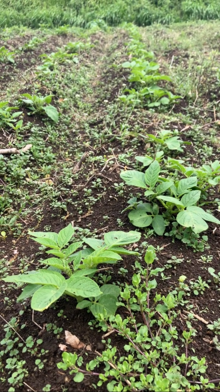 さらに種芋の半分は前回収穫して保存しておいたじゃがいも使用。昨年までの観察で、ある程度大きさと重さがある種芋でないと無肥料の畑では大きく育たないと実感したのですが、手元に残った芋は小さいものばかり。かなりシワシワでヒョロヒョロのもやしのような芽が出ているものも多く、その点も心配でした。